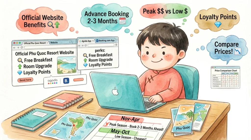 💡 예약 팁: 푸꾸옥 성수기는 **11월~4월(건기)**이며, 이 시즌에는 가격이 2배 이상 오르고 예약이 조기 마감됩니다. 최소 2~3개월 전 예약을 권장하며, 각 호텔 공식 홈페이지 직접 예약 시 아고다·부킹닷컴 대비 추가 혜택(조식 포함, 무료 업그레이드 등)을 제공하는 경우가 많으니 반드시 비교해 보세요.