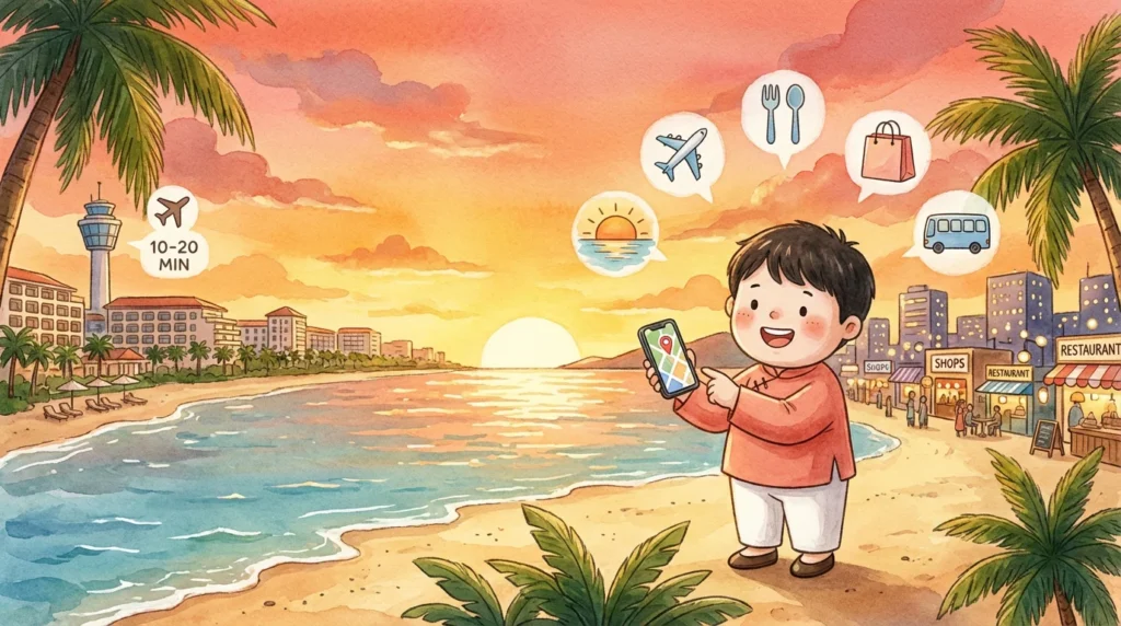 리조트 정문 바로 앞이 다양한 식당과 마사지 숍이 밀집한 ‘소나시 상가 구역’과 연결되어 있어, 외부 일정을 소화하기에 이보다 더 좋을 수 없는 극강의 위치 접근성을 자랑합니다. 5성급이지만 합리적인 숙박비를 유지하여 가성비 측면에서 완벽에 가까우며, 공항에서 불과 10분 거리라는 점도 큰 강점입니다.