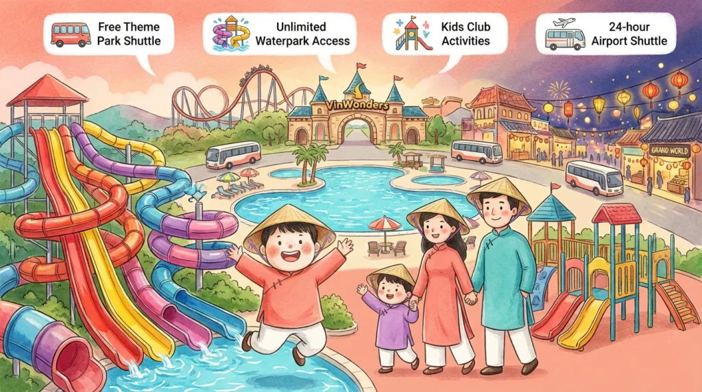 숙박객을 위한 자체 대형 워터파크(수영장 & 워터슬라이드)를 무료로 이용할 수 있다는 점이 압도적인 장점으로 꼽힙니다. 아이들을 동반한 가족 여행객들에게 가성비 최고의 숙소로 불리며, 그랜드 월드 야시장·코로나 카지노와 도보로 이동할 수 있을 만큼 가까워 야간 즐길 거리가 풍부합니다. 24시간 무료 공항 셔틀 운행도 큰 편의를 제공합니다.